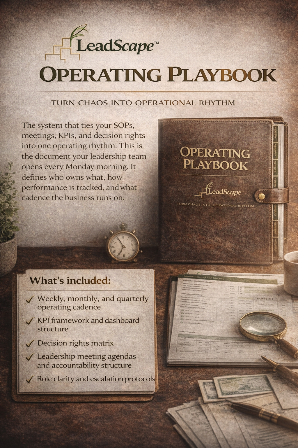 The system that ties your SOPs, meetings, KPIs, and decision rights into one operating rhythm. This is the document your leadership team opens every Monday morning. It defines who owns what, how performance is tracked, and what cadence the business runs on.