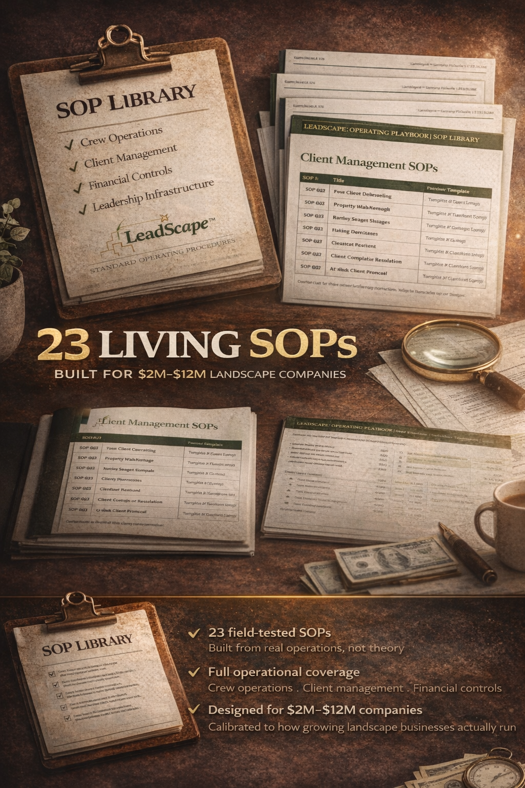 The operational documentation most landscape companies never build. 23 living SOPs covering every critical workflow from crew deployment to client escalation to financial approvals. These aren't binder fillers. They're decision tools your managers use daily.