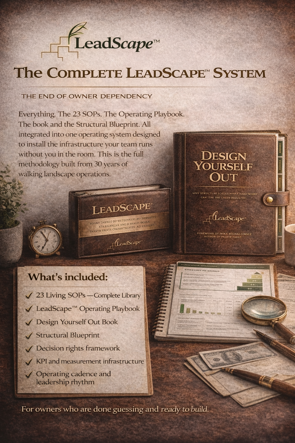 Diagnostic tools to measure the gaps. SOPs to close them. The Playbook to run the system. And the complete LeadScape™ methodology to install the infrastructure your team owns. Everything is built for $2M–$12M landscape companies, backed by 30 years of industry experience.